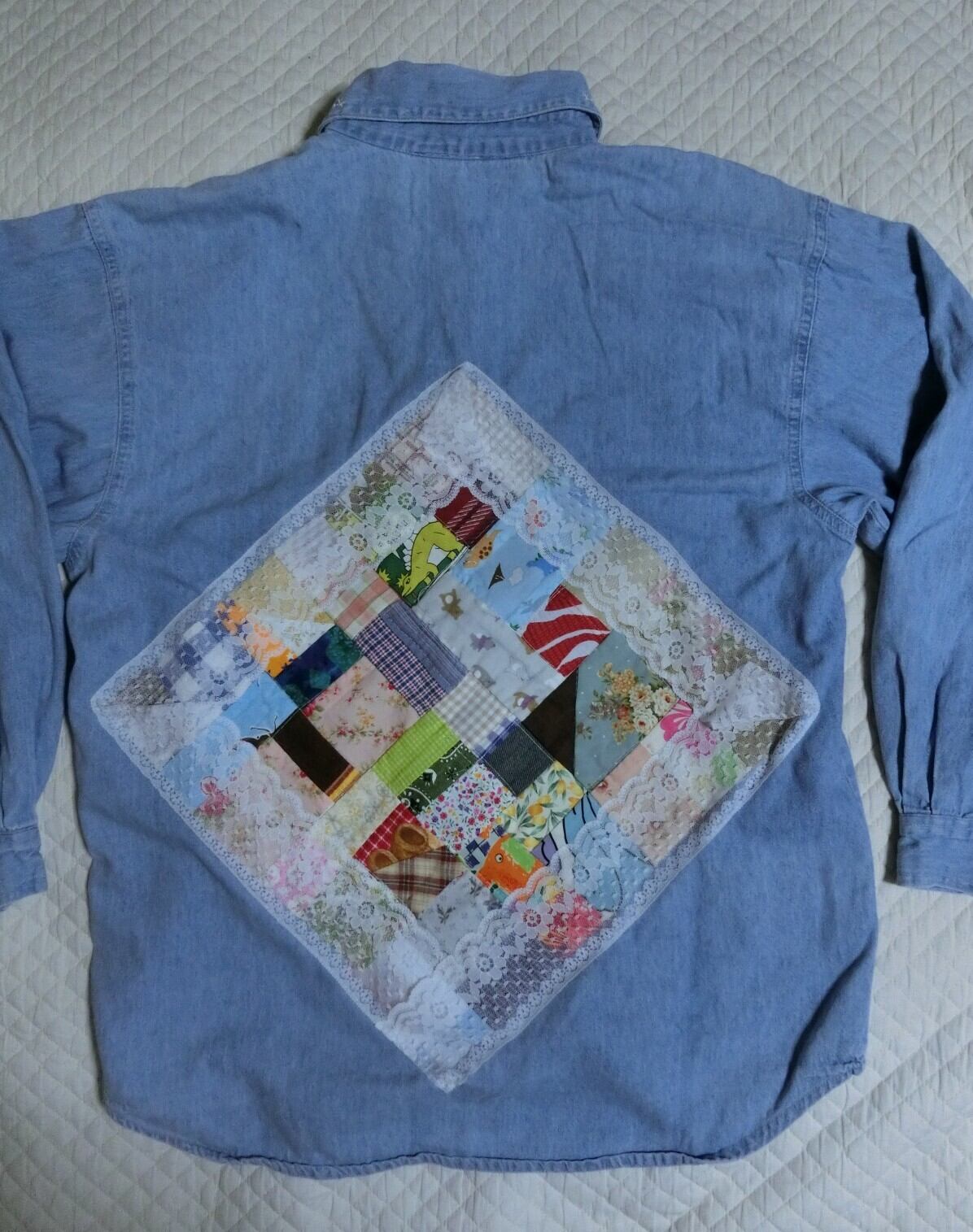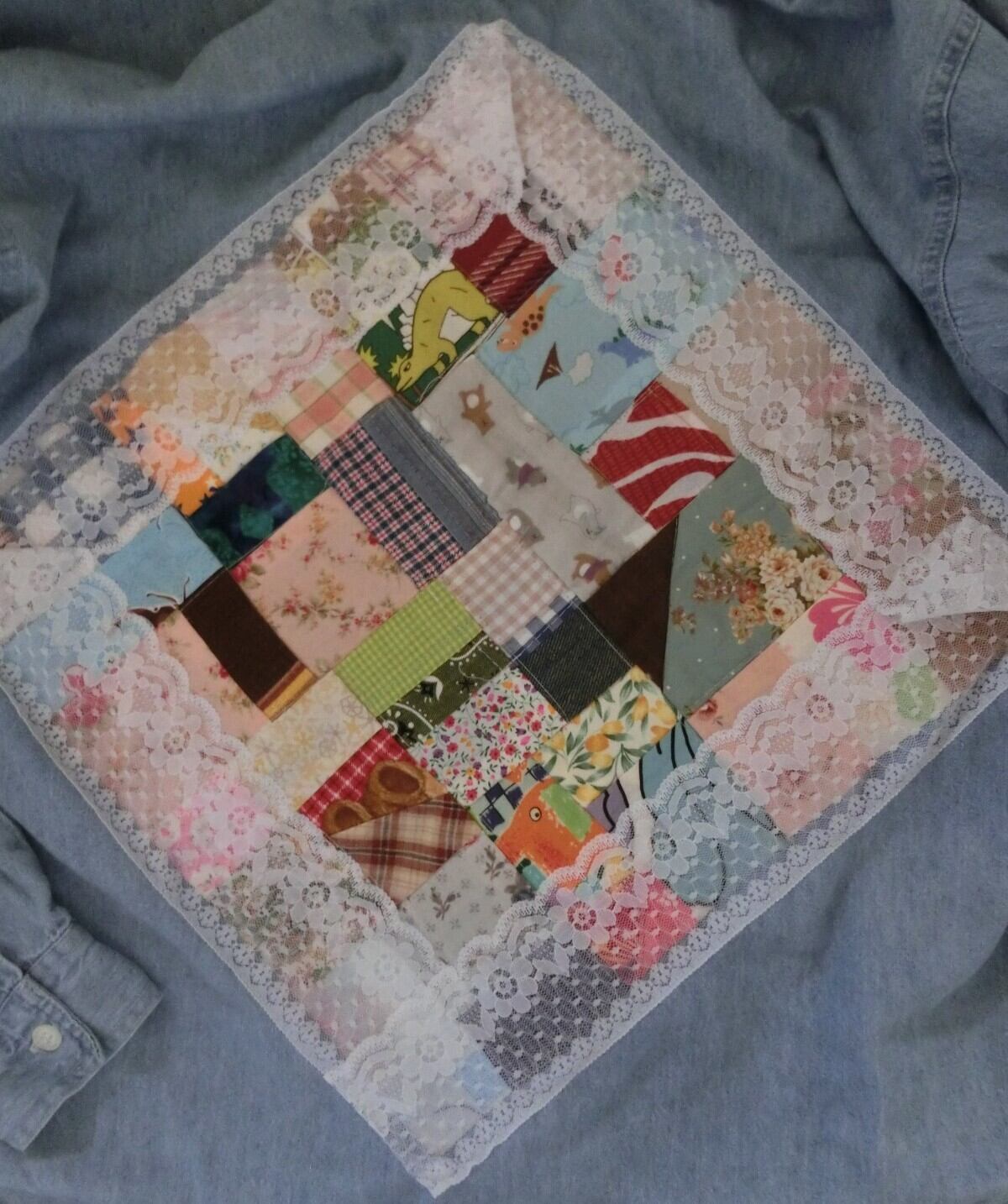 後ろにパッチワークのアップリケを付けてみました。レースで縁取りしています。