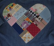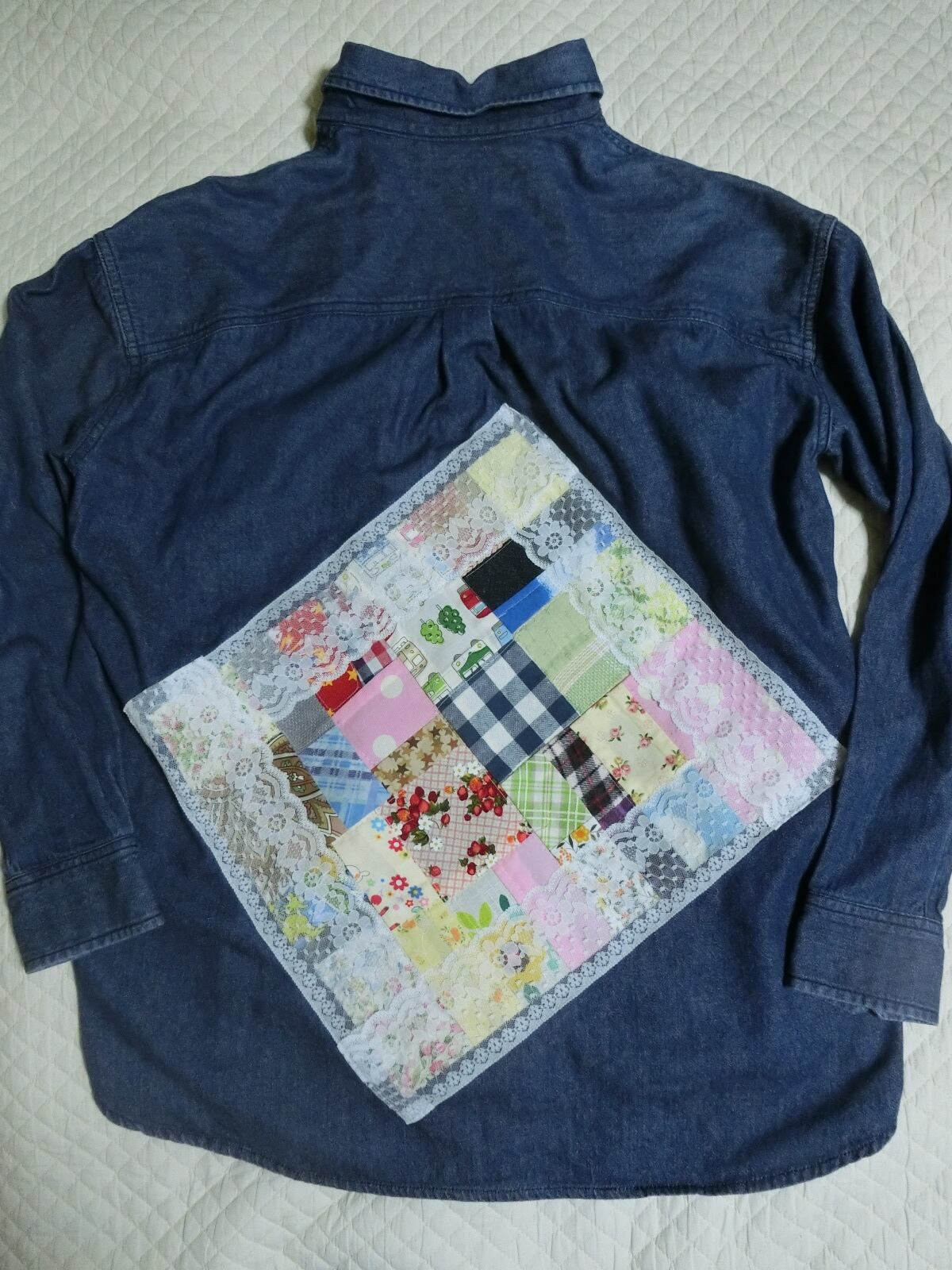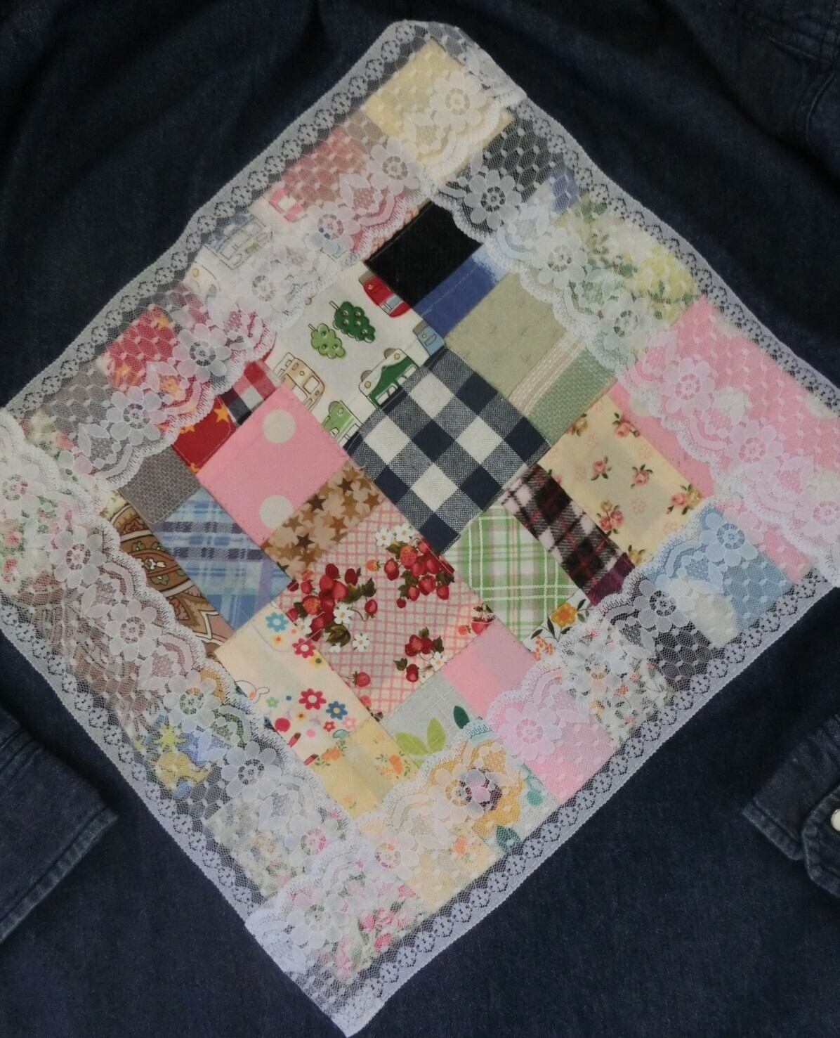 後ろにパッチワークのアップリケを付けてみました。レースで縁取りしています。