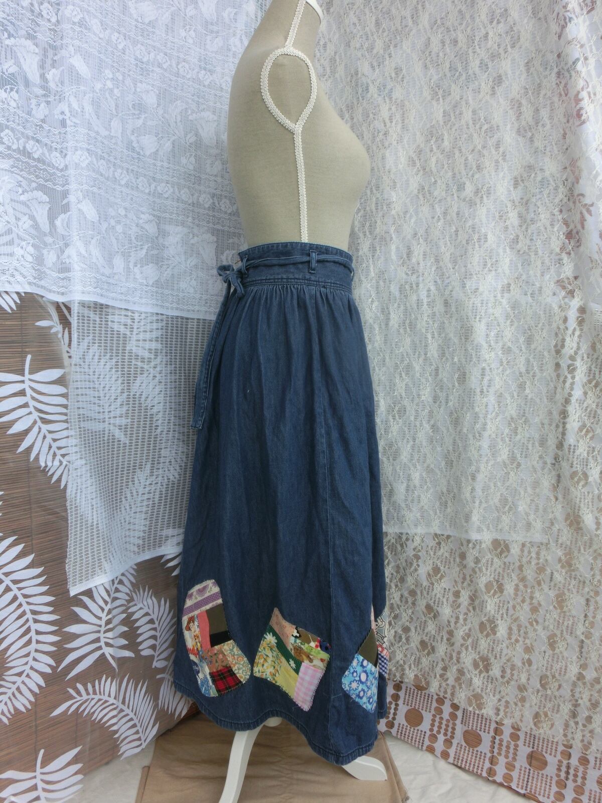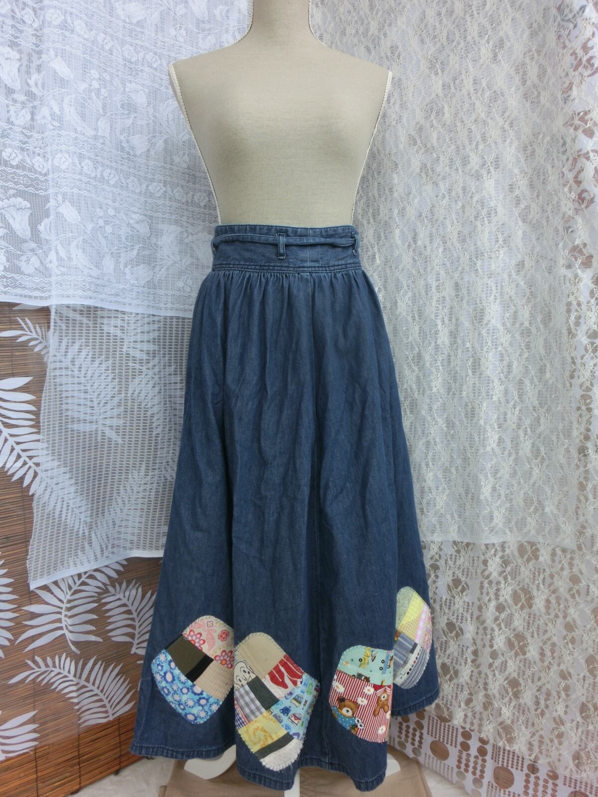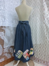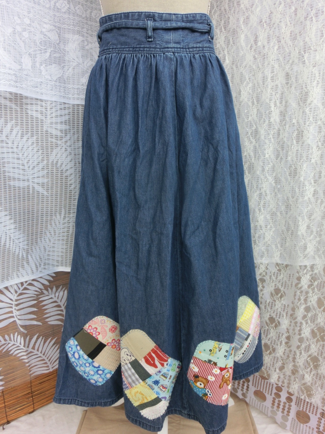 古着のデニムのギャザースカートをパッチワーク風にリメイクしました。