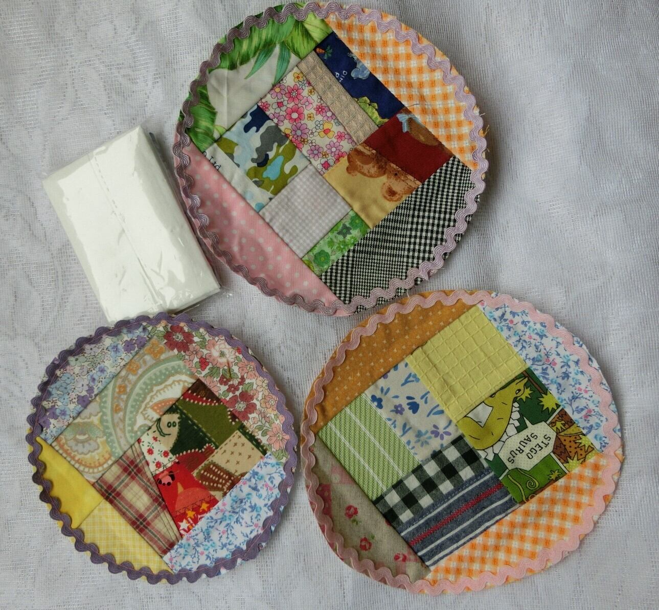 ハギレをパッチワークしたサークル型のアップリケの3枚セットです。