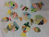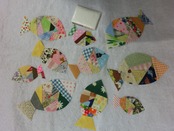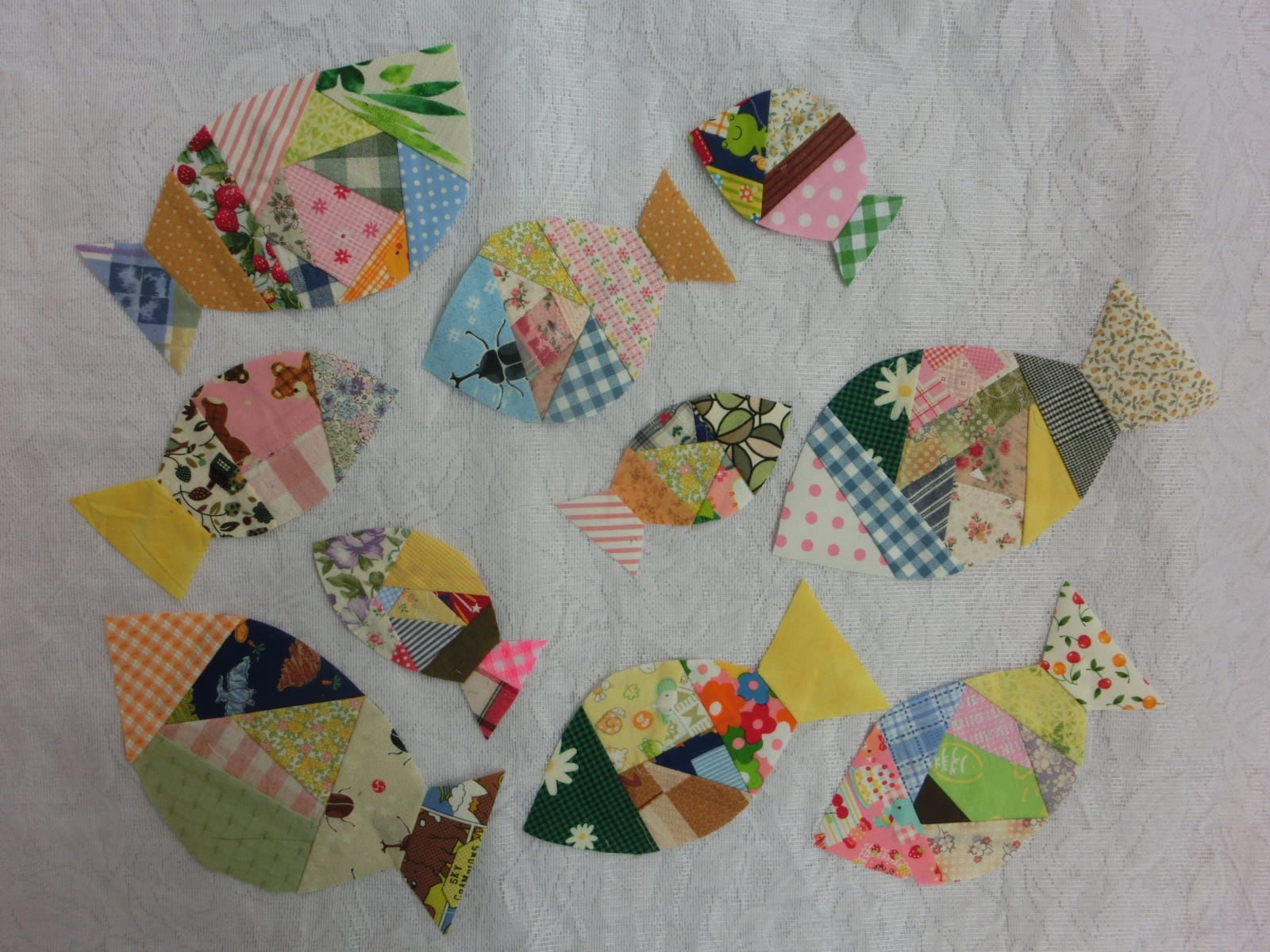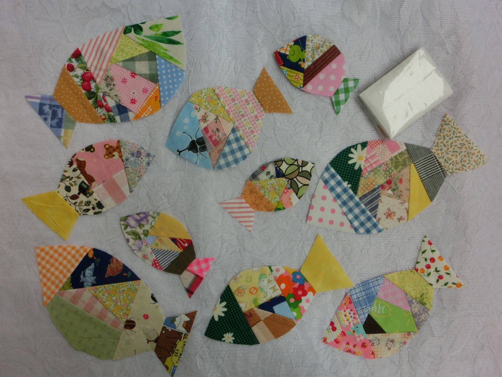 ハギレをパッチワークしたお魚型のアップリケです。色々な大きさのものが混ざって10枚セットになっています。(縦長約10~15㎝)
